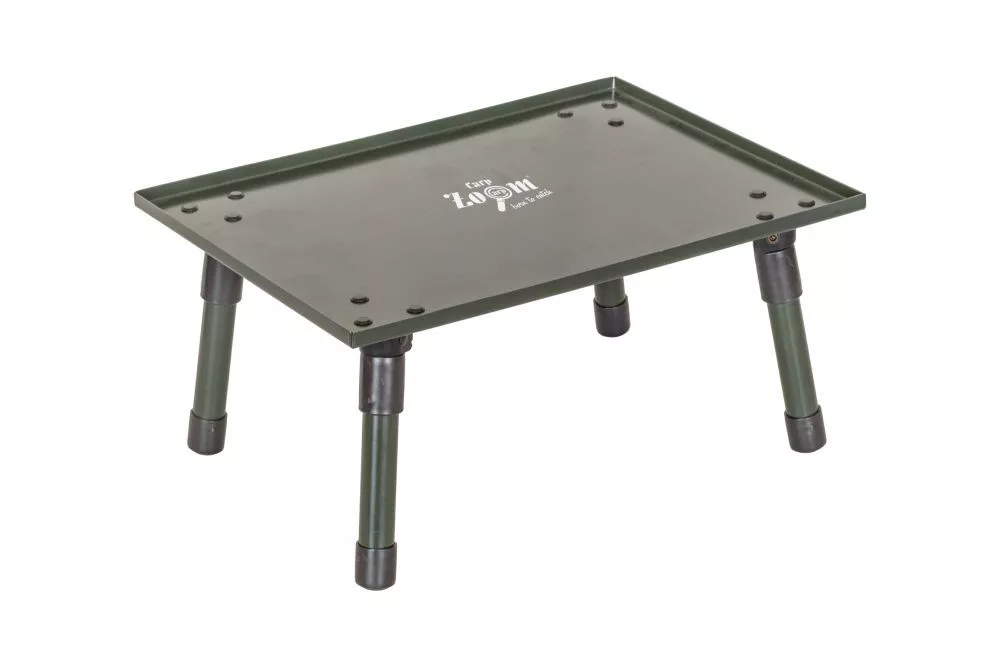 Kisméretű, fém, akár a hátizsákban is szállítható csalizó asztal. Mérete 34x26 centiméter, így alkalmas a használt csalik, egy doboznyi bekevert etetőanyag, csúzli, horogszabadító és egyéb szükséges felszerelés tárolására. Peremes kialakításának köszönhetően a rajta lévő apróbb kiegészítők sem gurulnak le róla. 15 centiméter hosszú lábai egy mozdulattal kinyithatóak. Használatával kényelmesebbé tehetjük a horgászatot, de akár a sátorban is használható az irataink, telefon és a reggeli tea vagy kávé tárolására. Remek alternatíva abban az esetben is, ha csak korlátolt mennyiségű felszerelést vihetünk magunkkal. • Mérete: 34x26 cm. • Szállítási mérete: 34x26x3,5 cm. • Súlya: 670 g.